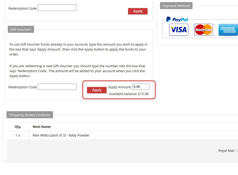 appear showing your Balance. Enter the amount to apply from the funds in your Gift Voucher Balance.